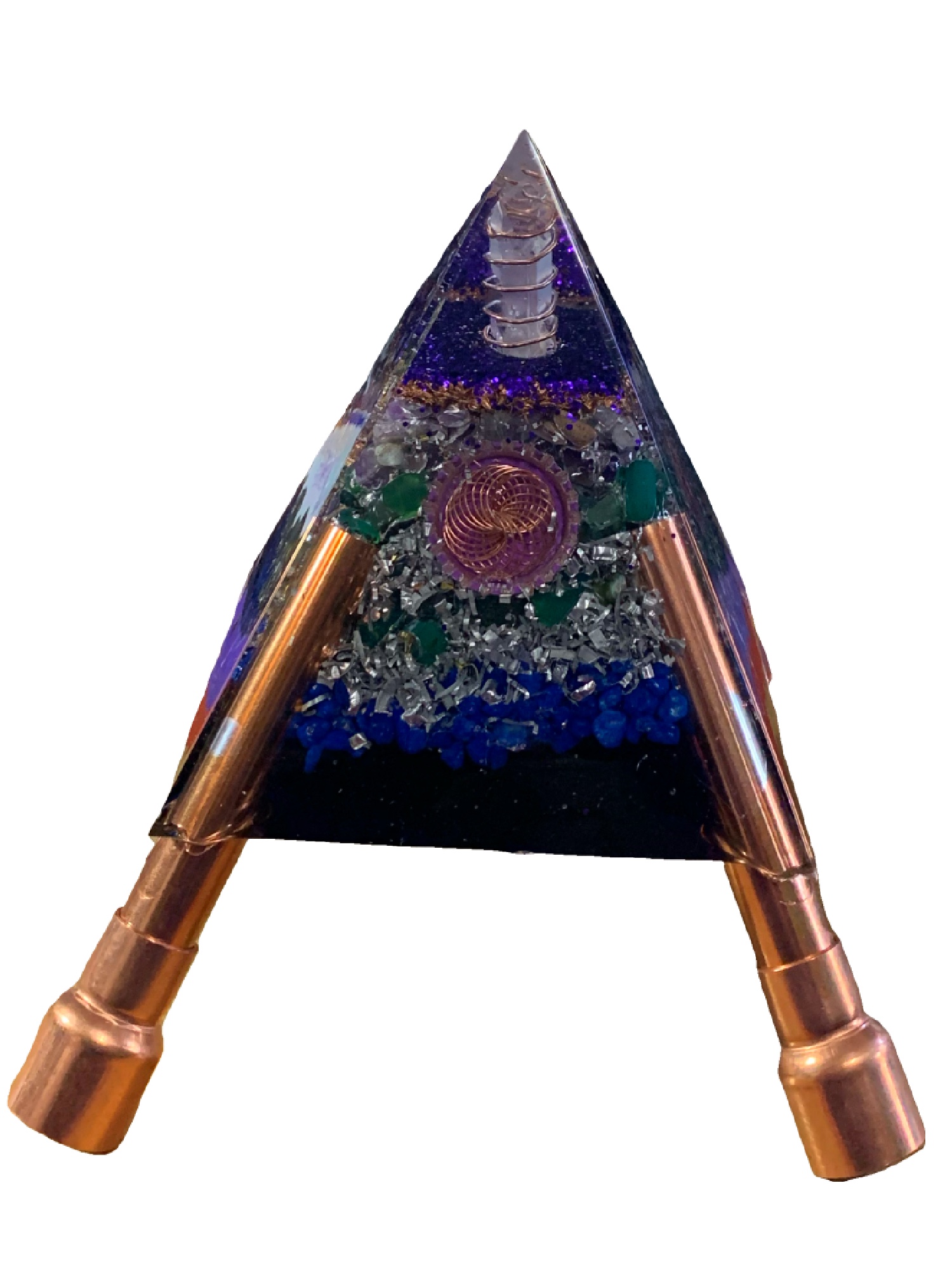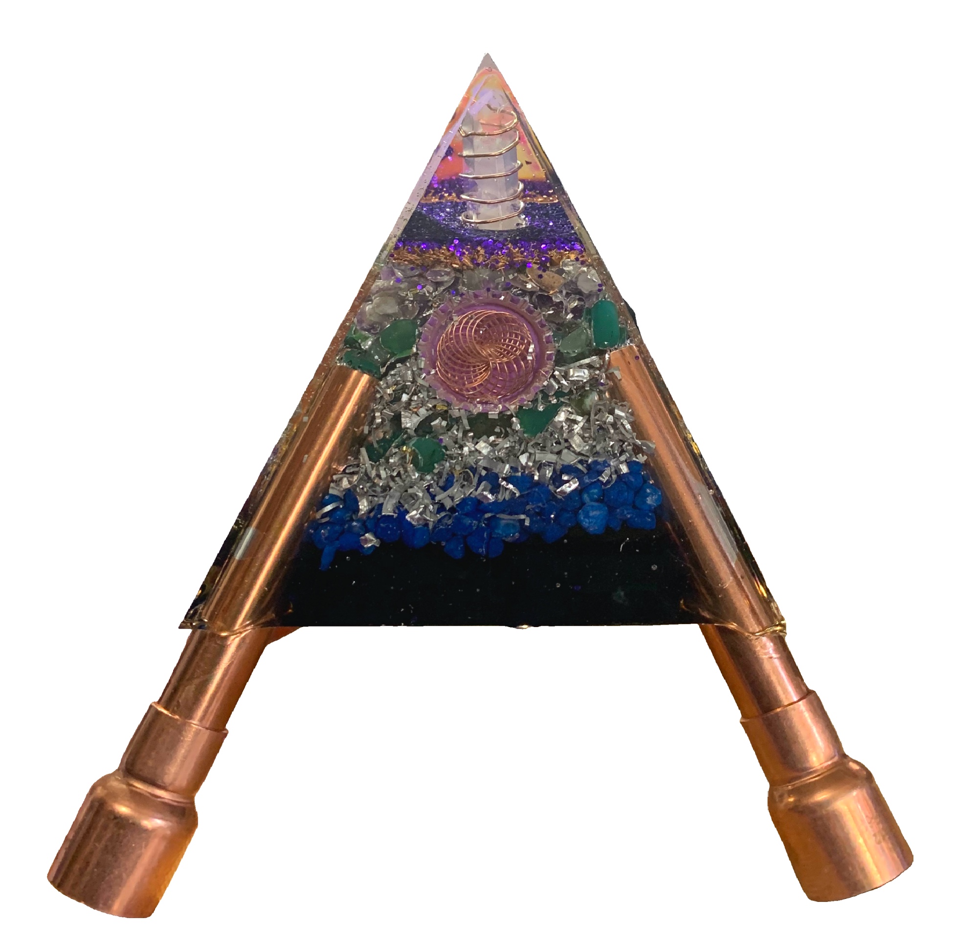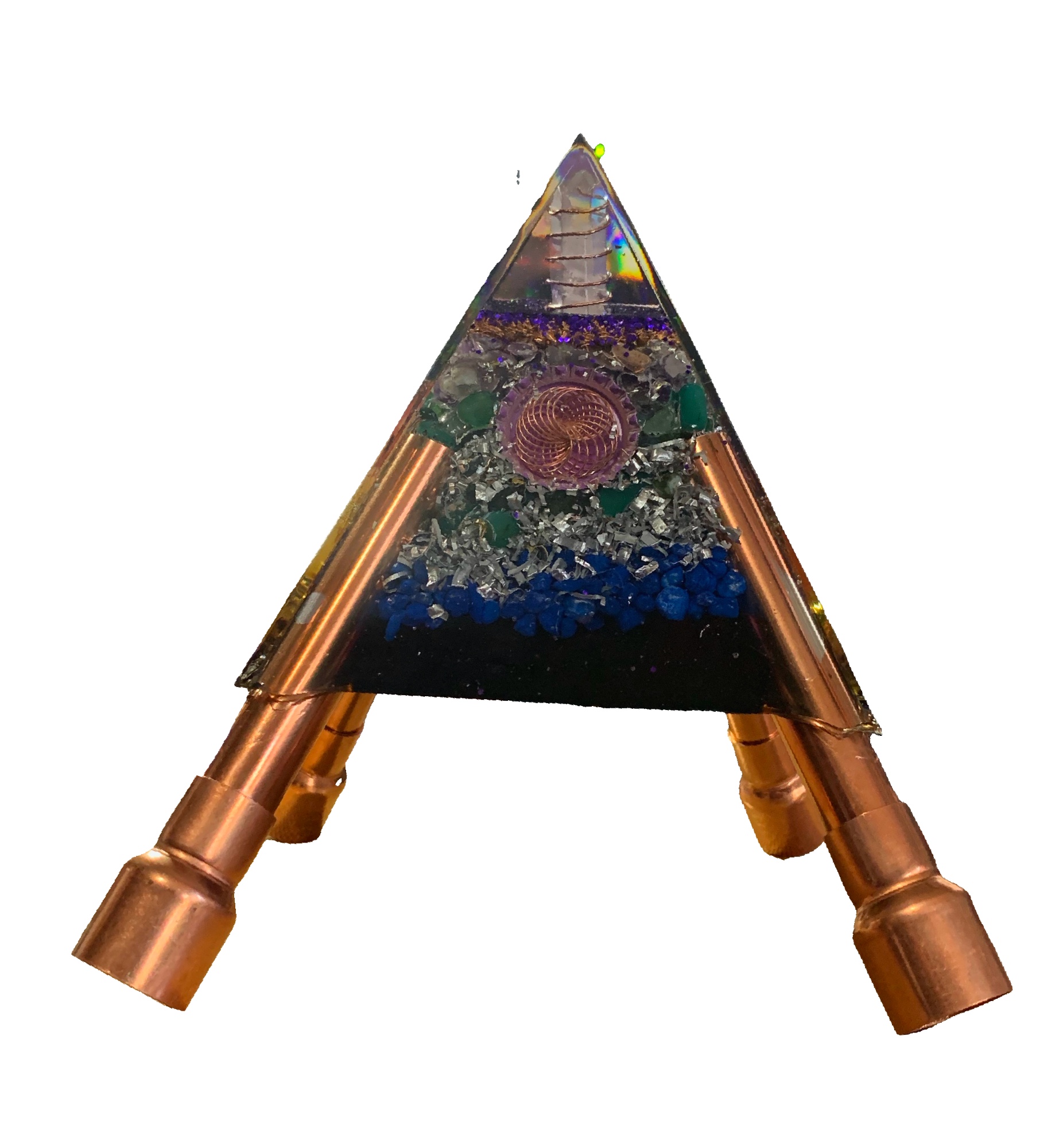 This Orgone Pyramid has a laser crystal point at the apex. Metal vortex spirals are suspended in windows on each side of the pyramid to amplify the energy flow. Pure copper and aluminum metal shavings.