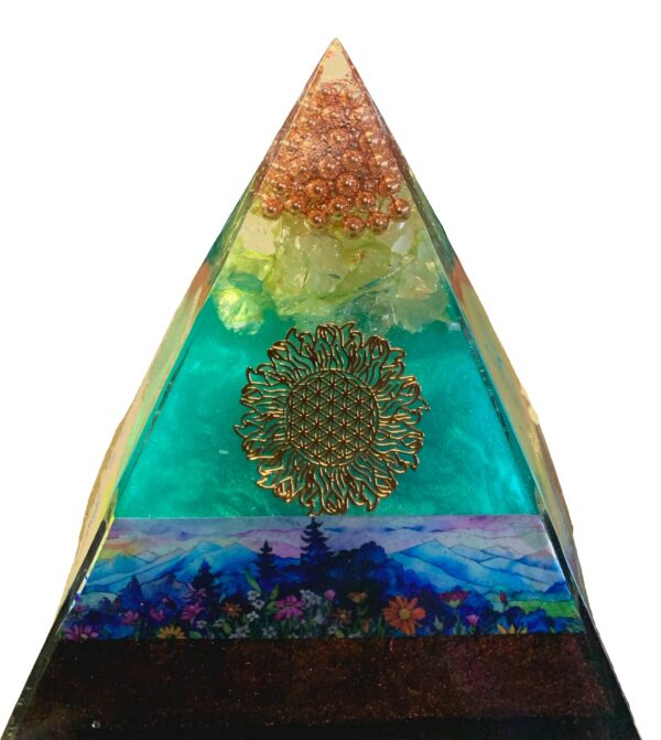Yellow citrine gemstone chips were chosen for inclusion in this art piece because it boosts confidence, radiates joy, abundance, happiness. The copper coated steel balls at the apex amplify the orgone energy. The vibrant  green mica is a silicate mineral which promotes beauty and calmness. The sunflower medallion symbolizes a sun shiny day, full of optimism.  The coppery black shungite powder at the base is an amazing mineral which purifies as it protects against harmful frequencies. The rainbow mountain range motif  symbolizes new horizons just waiting for you. As always, this configuration is effective for dispersing harmful frequencies as well all as enhancing health and well being. Powerful orgone matrix. Elegant ~ effective.